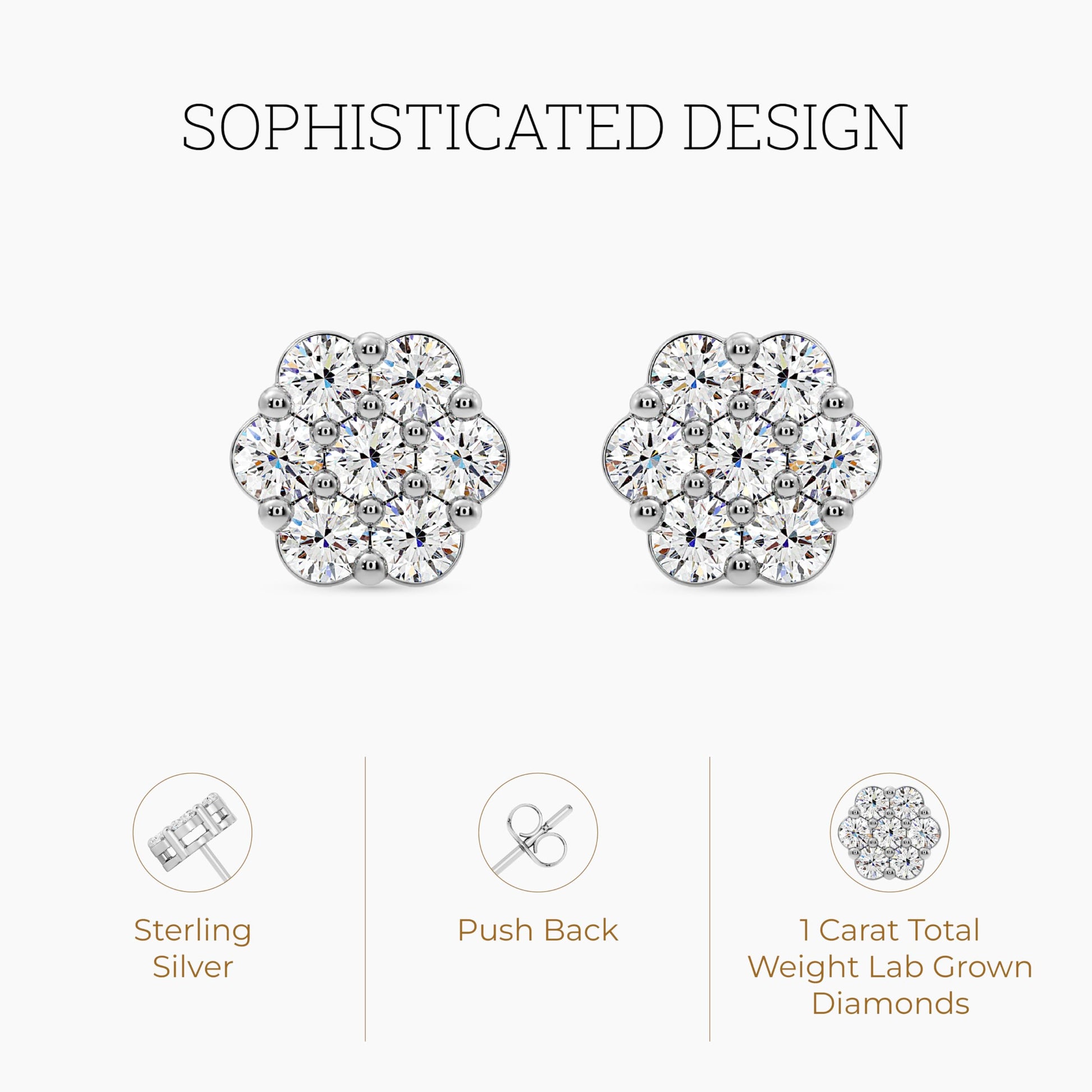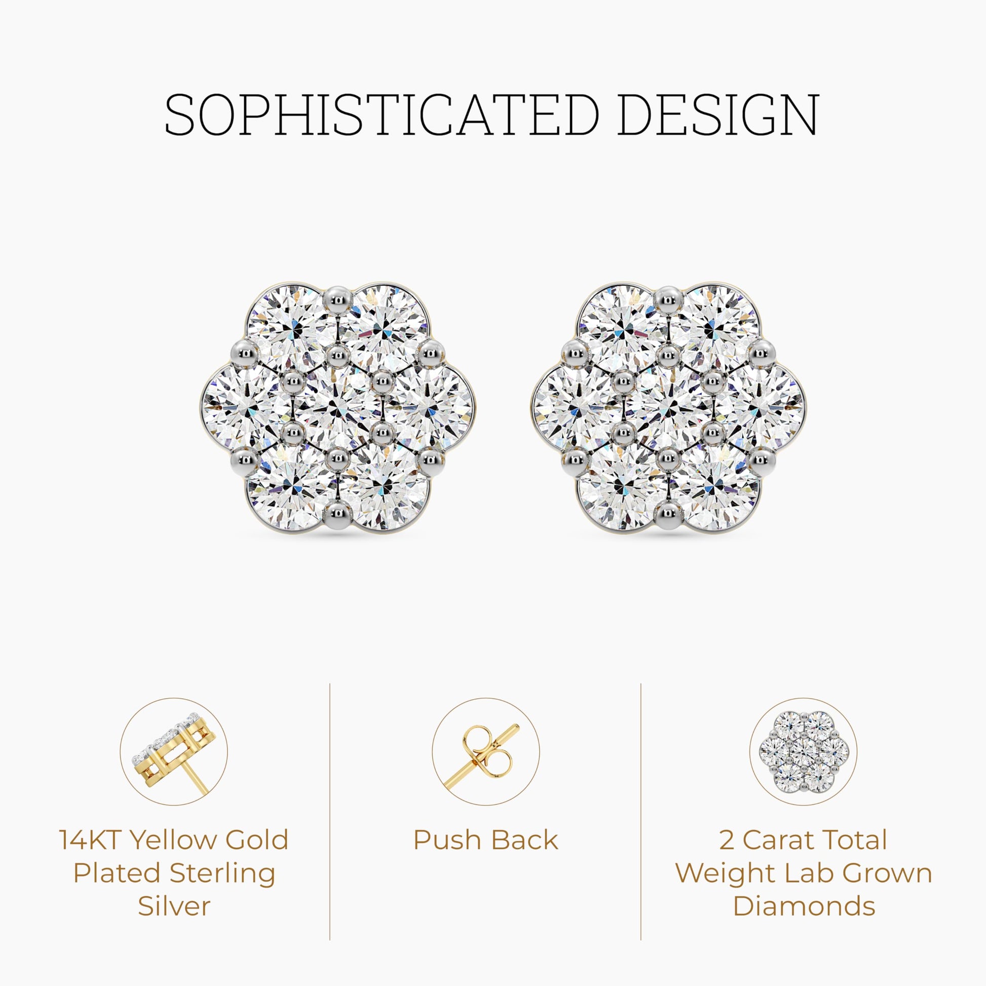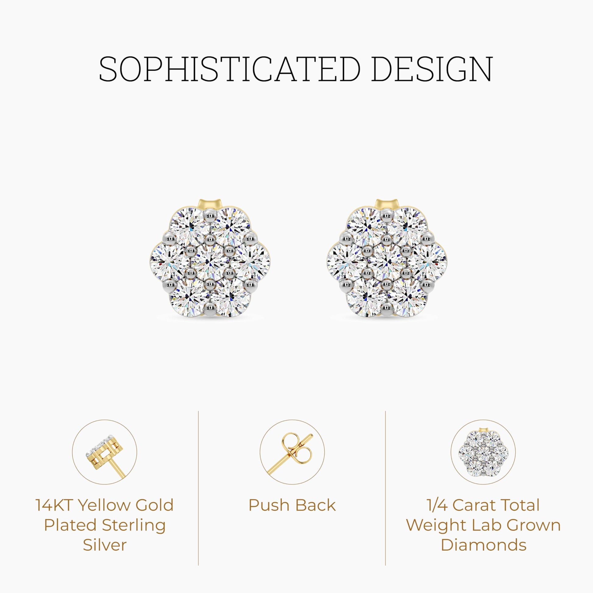 Gilded Lab-Grown Diamond 7 Stone Flower Earrings for Women in 925 Sterling Silver and 14KT Yellow Gold Plated Silver | Hypoallergenic Fine Jewelry | Hinged Closure | SI1 Clarity, F Color |1/4,1/2, 1,2 Carat Total Weight