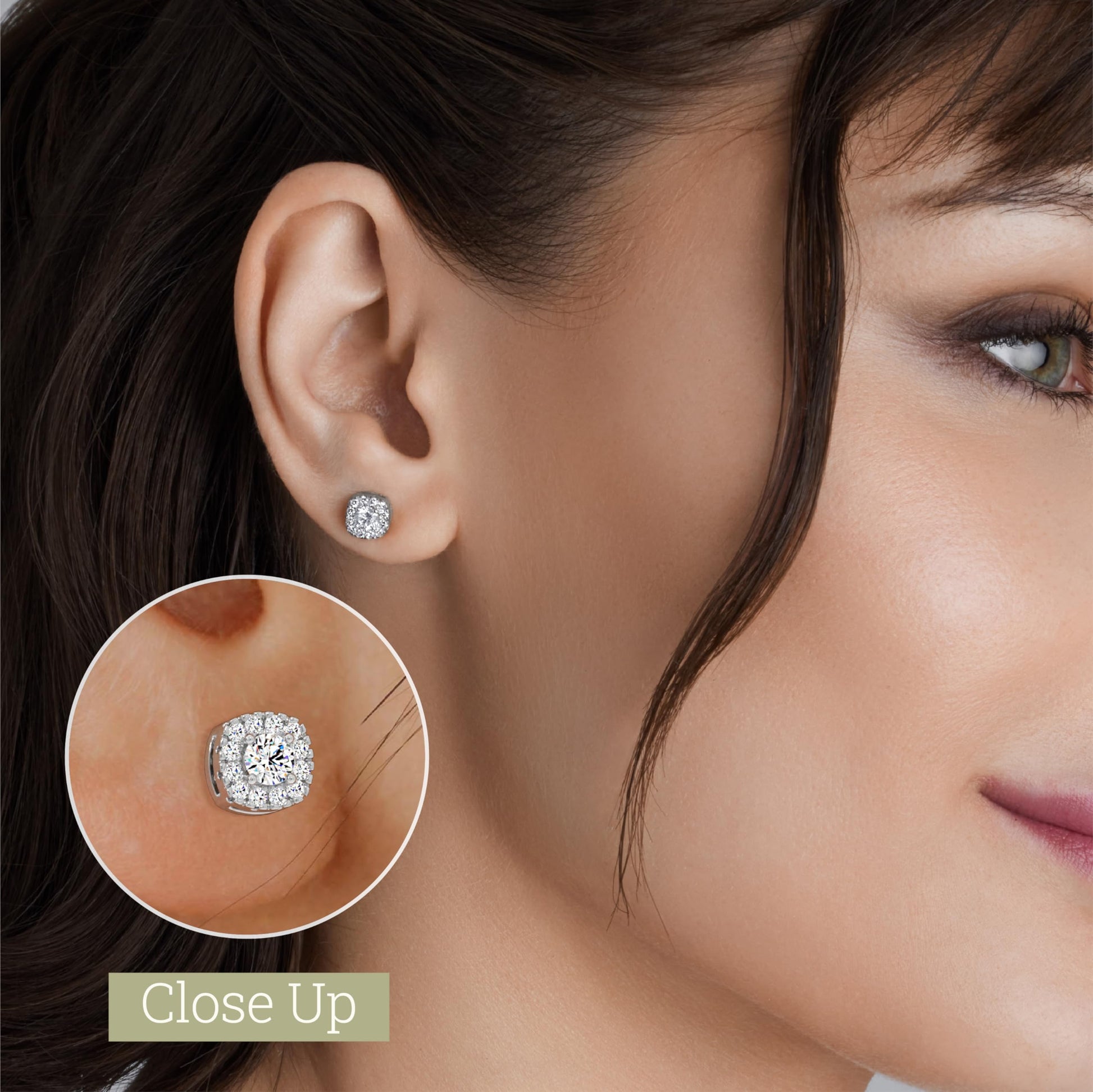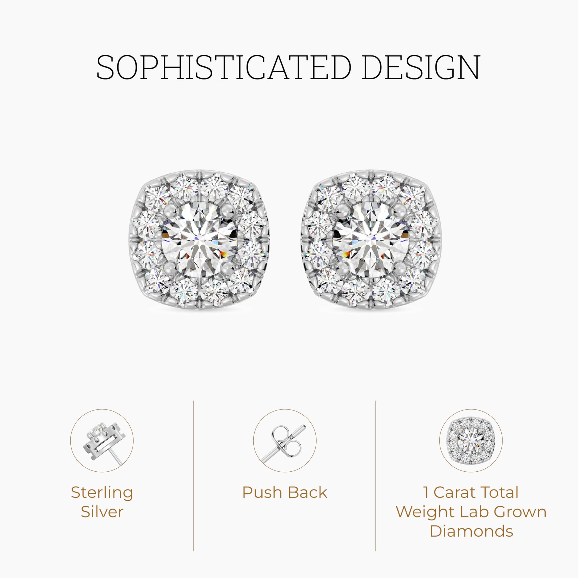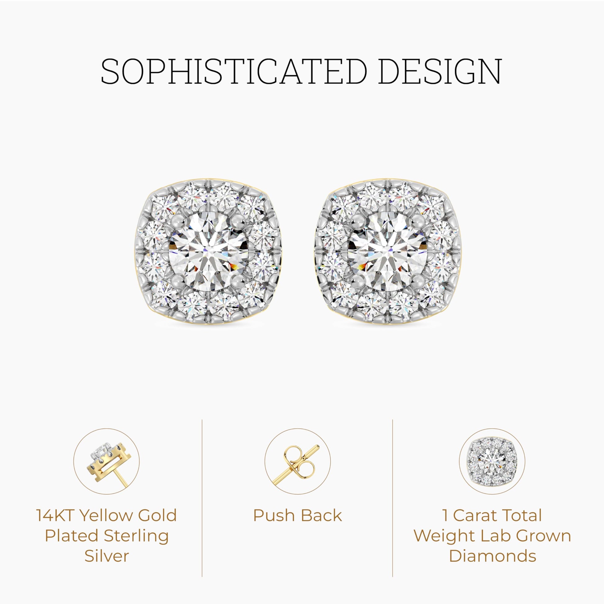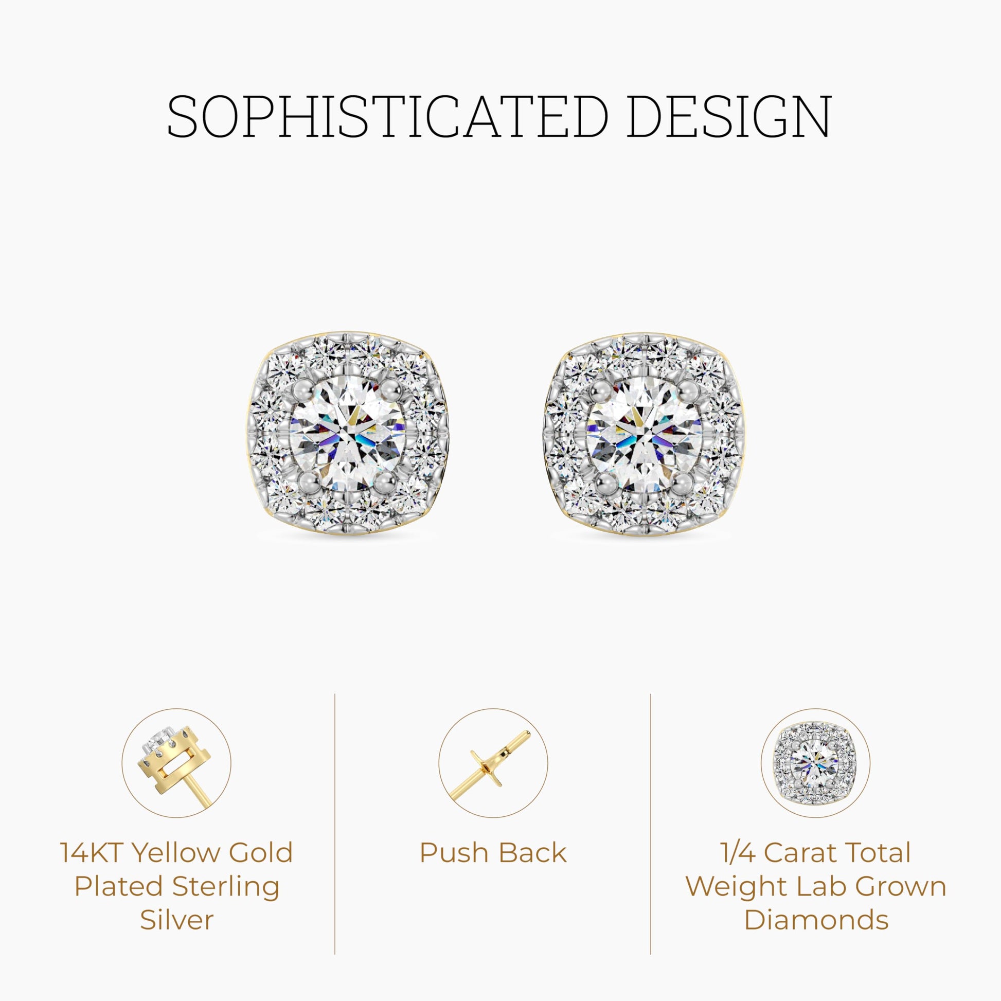 Gilded Lab-Grown Diamond Sterling Silver and 14KT Yellow Gold Plated Silver Stud Earrings for Women | Cushion Halo Shaped Studs | Hypoallergenic Fine Jewelry | Prong Setting, Push Back Nut | SI1 Clarity, F Color 1/4, 1/2, ,1 Carat Total Weight