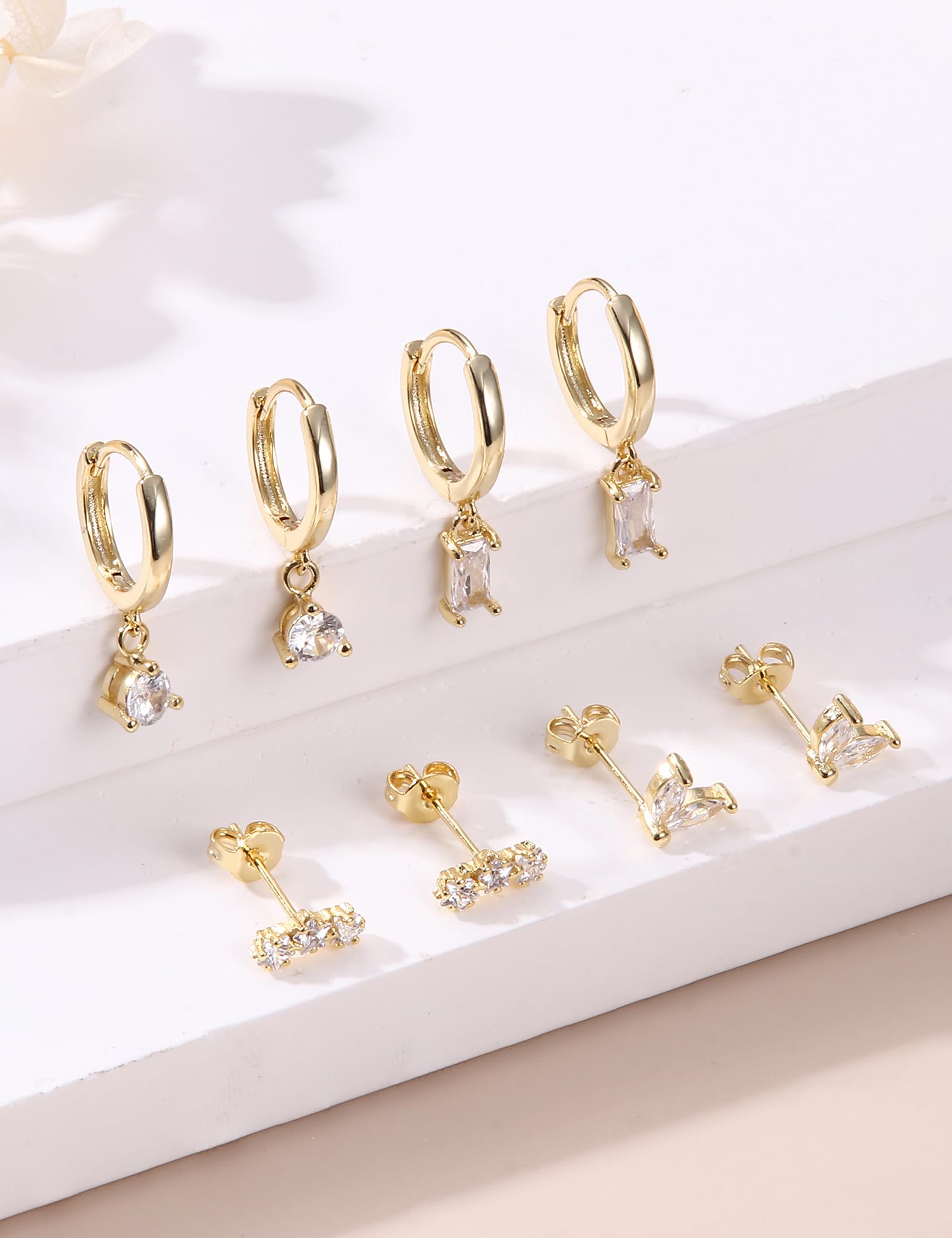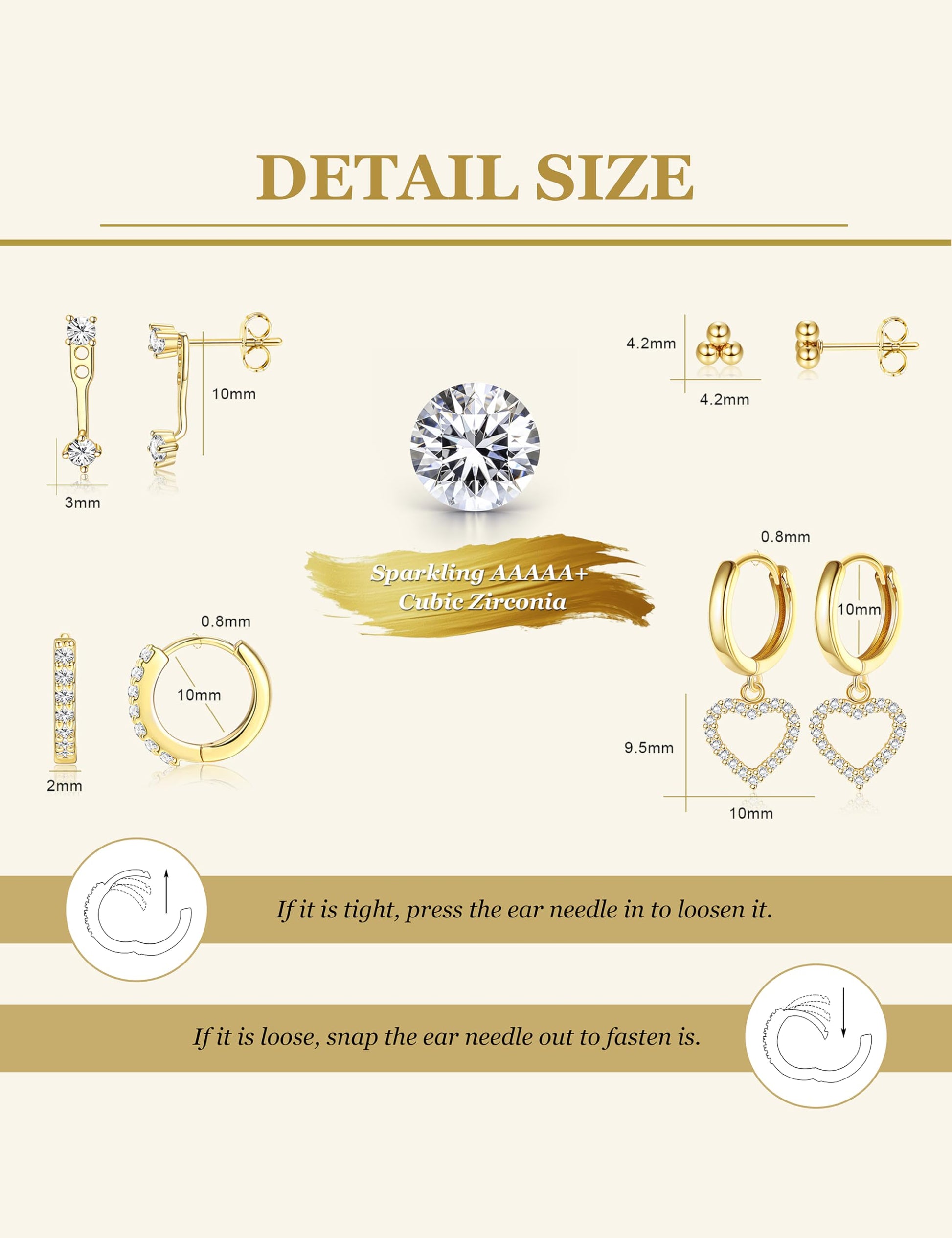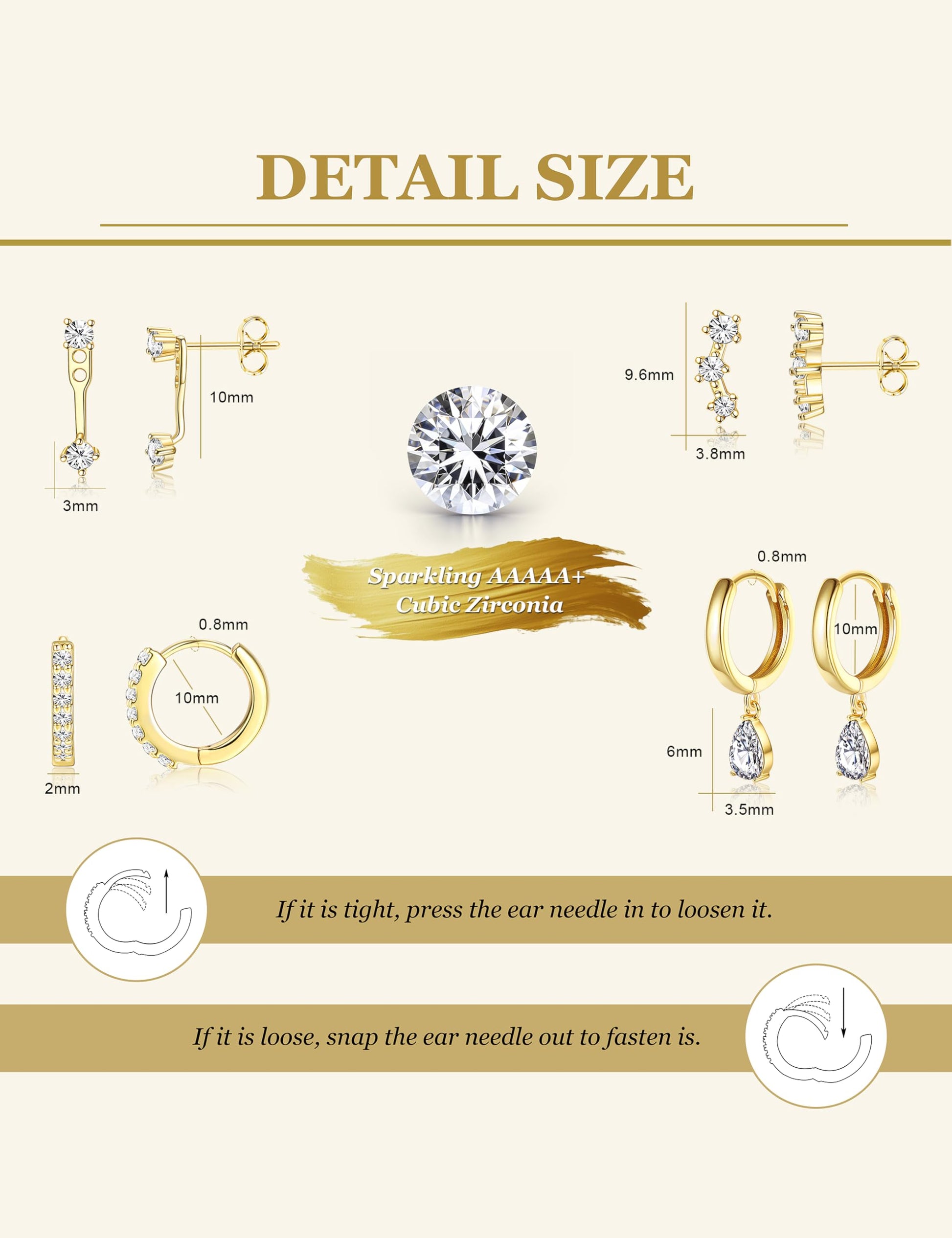 - Gold Hoop Earrings Set --4 different trendy earrings in a set :Stud earrings,earring jackets,small hoop earrings and hoop dangle earrings. Each simple and stylish gold earrings set has been carefully designed and matched so that you will never go wrong in any of your daily outfits
